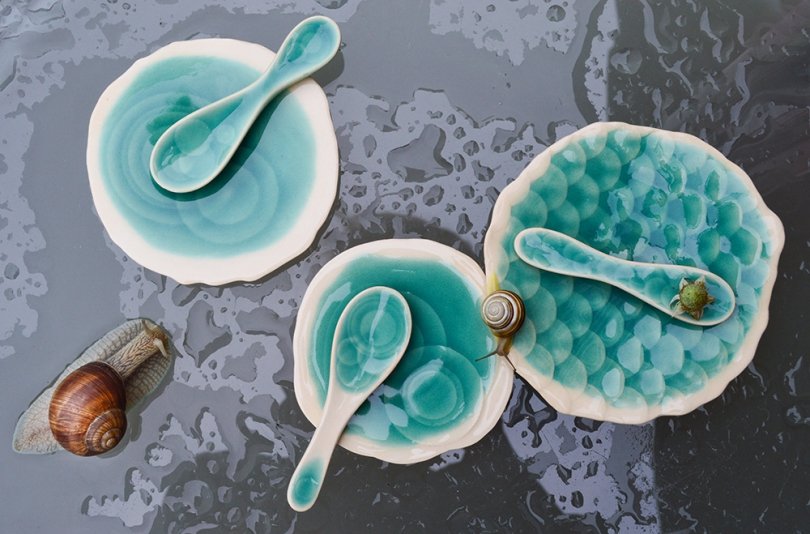 Képzeletben már felszereltem az új konyhámat a steppelt paplanokat idéző ,”You and Me” néven futó bögréivel, és a vizes helyiségeket a türkiz, pikkelyszerű, vízidéző tárgyaival. Érdemes barangolni az Ecce HOME honlapján, a művész lakberendezési tárgyak mellett izgalmas ékszereket is készít.