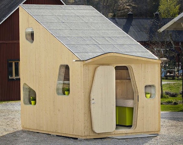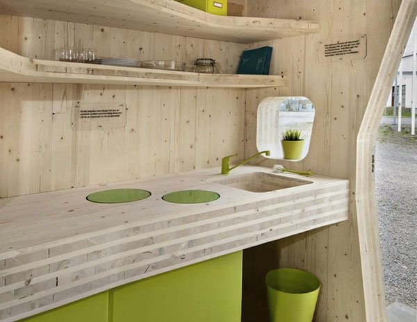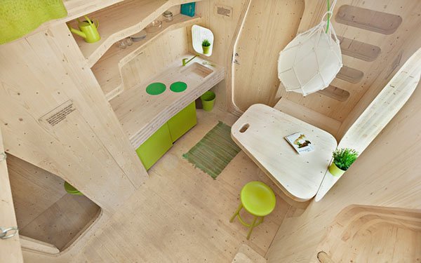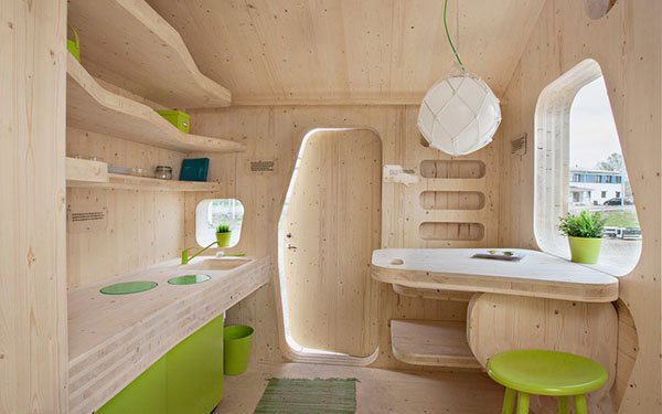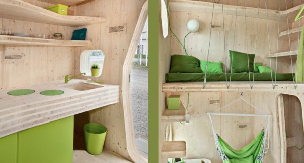 Az eredetileg 25 nm-esre tervezett házikók méretét, hogy a diákok pénztárcájához igazítsák, lecsökkentették 10 (!) nm-re. Itt jön a képbe a skandinávok zseniális térkihasználási képessége, amit az IKEA óta mindenki ismer. Mennyezettől a padlóig minden egyes centiméter ki van használva, az alsó szinten elfér egy konyha az étkezőpulttal, íróasztallal és egy fürdőszoba fülkével. A galérián a pihenésé a főszerep, itt található ugyanis az ágy, és innen lóg alá egy vagány élénk zöldben pompázó pihenőhinta is. Az építészek, ahova csak lehetett polcokat terveztek be a kisebb méretű személyes tárgyak elhelyezéséhez.