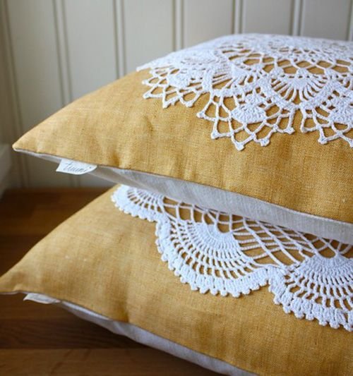 Az újévet idén a Balatonon kezdtük egy kedves barátnőmék ízlésesen berendezett balatoni nyaralójában. Ott bukkantam rá néhány csodálatos párnára: egyszerű és nagyszerű ötlet volt, hogy a huzatra kör alakú csipkealátétet varrtak, így azok sikkes kiegészítői lettek a púderes szobának. Annyira inspiráló volt, hogy én is elkezdtem ötleteket gyűjtögetni, hogy a nagyinál porosodó csipkéket miként hasznosítsam újra. Alább pedig az említett párnák, majd a többi kedvenc csipkés ötletem.