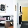 A lakó kedvence a kanapé a nappaliban, amit saját kezűleg újított fel, ezt egy feketére pingált kerekeken álló raklapasztal egészíti ki. A falra egyszerű keretbe foglalt fekete-fehér fotók kerültek, amelyek helyét egy hatalmas sárga kereszt jelöli ki. Remek bizonyíték ez arra, hogy milyen jól mutat együtt az élénk sárga a monokróm színvilággal, azonnali helyet követelve a vidámságnak. A konyha inkább a modern vonalat képviseli, itt kiegészítők szintjén érhetjük tetten a bolhapiacot, régi fonott kosarak és feliratozott fa tároló ládák képében.