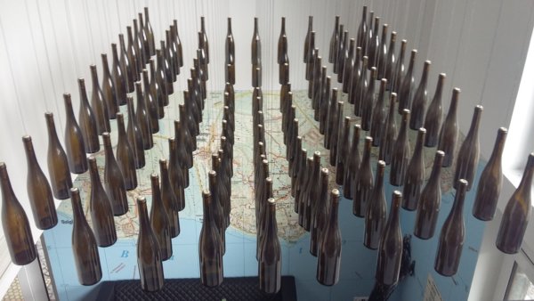 Úgyszintén újrahasznosított borosüvegek: acélhuzalon függő üvegek szolgálnak a nagy belmagasságú tér dekorációjaként. Fantasztikus látvány volt.