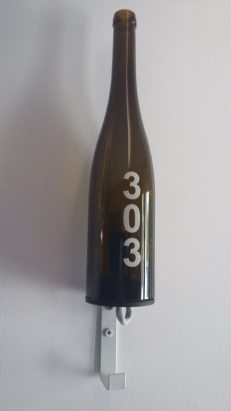 A hotel belsejében több helyütt visszaköszöntek az új funkcióval felruházott borosüvegek. A lenti képen látható üveg például szobaszám-jelölő és falikar egyben, amely hangulatosan megvilágítja a folyosót.