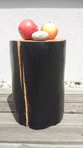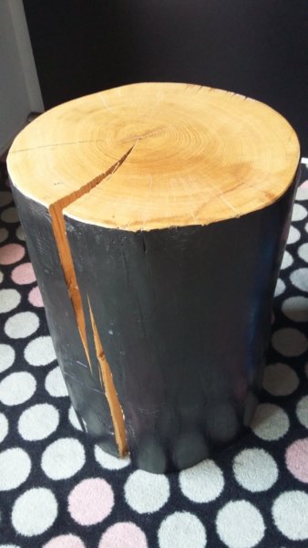 Nézzük például ezt a tuskót, ami egy kisasztal alá volt betolva. Ülőkének is kiváló, mi például tároló asztalként használtuk. Tetszik, hogy csak az oldalát kenték le, így nem veszítette el természetes fa színét, és mégis illik a szoba fekete bútorzatához.