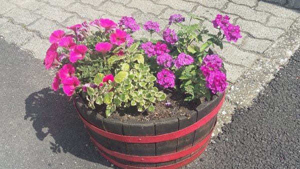 Badacsonytomajban sétálva egy borospince előtti virágos dézsa, amely boroshordóból lett kialakítva.