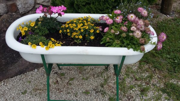 A Káli-medencében bukkantam erre az útmenti régi mosóedényre, amelybe szintén virágokat ültettek.
