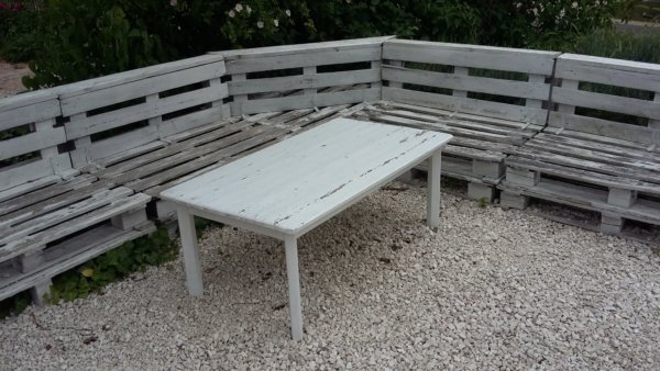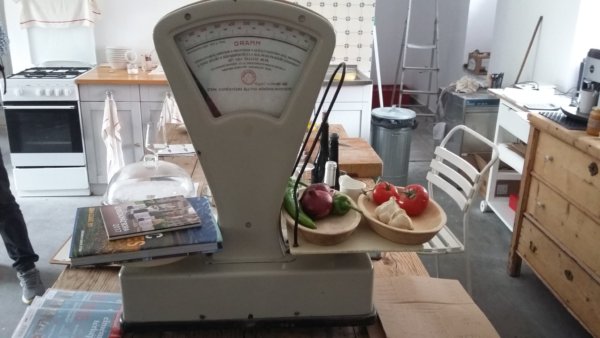 A Káli Kövek Borászat kertje és vendégfogadó tere is teli volt újrahasznosított kiegészítőkkel, bútorokkal. A lenti fotón a kerti raklap bútorokat látjátok, belül pedig egy régi mérleg polcként él tovább. A kertben régi varrógép fém lábai tartják a nyers asztallapot.