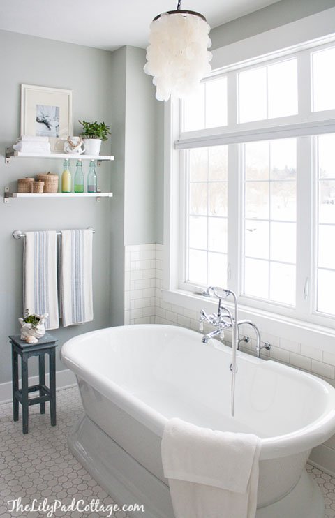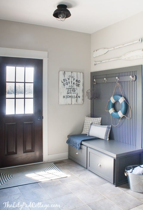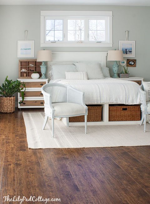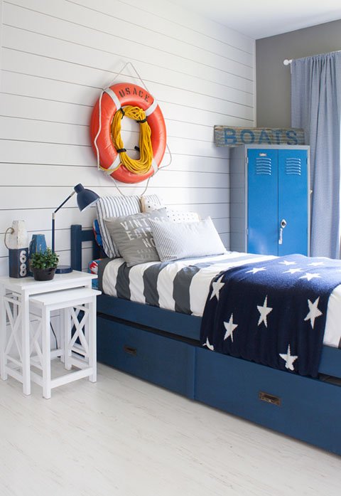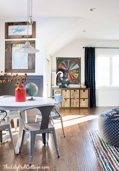 A hátsó bejárat különösen tetszik, a mentőövvel és evezőlapátokkal dekorált felülethez remekül passzol a galambszürke előszobafal. A hálószobában is a fehér és a natúr színek dominanciája érhető tetten, amelybe szinte észrevétlenül simul bele az éjjeli lámpa koptatott kék váza. A metrócsempe, a fehér lebegő polcok a fürdőszobában is visszaköszönnek, remek hátteret biztosítanak a tekintélyes méretű szabadon álló kádnak. A játszószobában hatalmas fonott kosarak rejtik el a sok babát és matchboxot, a régi földgömb és a vörös zománcedény is szuper egységet alkotnak a körasztal tetején.