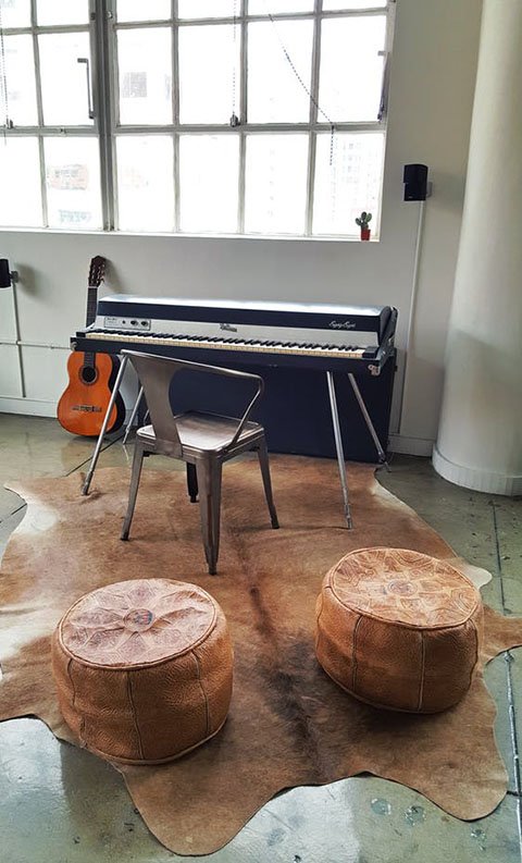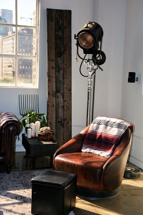A nappali központi eleme egy ikonikus Chesterfield kanapé, egyik oldalán egy modern Eames hintaszék foglal helyet, míg a másik oldalán egy bolhapiacról érkezett barna bőrfotel uralja a teret. A ’40-es években használt mozilámpára szintén egy régiség piacon bukkantak rá. A házigazdák egyébként is rajonganak a filmekért, egy hatalmas rejtett vetítővászon gondoskodik az élvezetes moziélményről, amelyet a nagyméretű ágyra bekuckózva tesznek teljessé. Itt találta meg a helyét a család kedvence is, egy boros hordóból átalakított menő kutyaházat birtokol. A zenesarkot egy nagyméretű marhabőr jelöli ki, ahol egy vintage zongora áll, valamint itt egy gitár, egy fémszék, illetve két bőrpuff lett elhelyezve.
