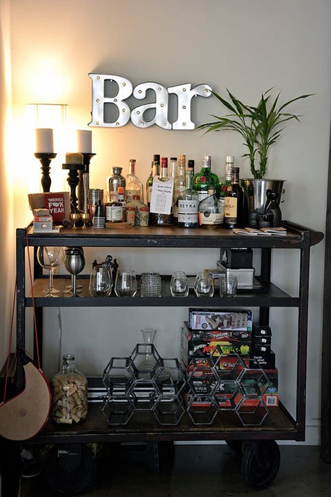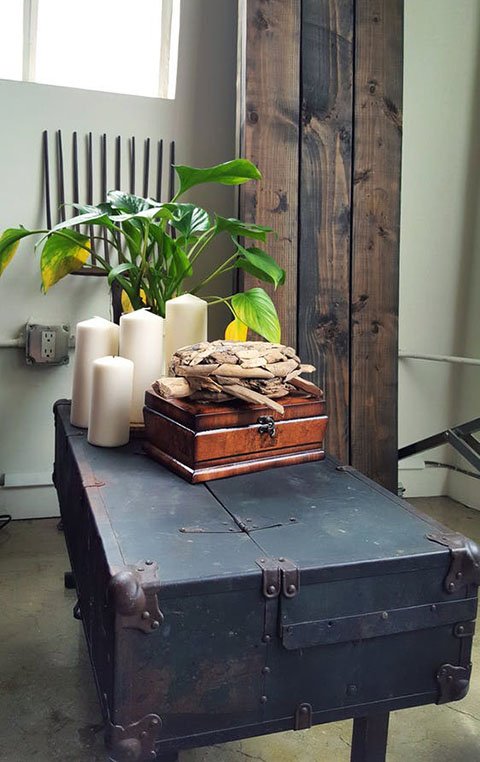 Miután a megálmodott alap bútorokat beszerezték, az egészet megfűszerezték néhány karakteres kiegészítővel: fémtáblával, betűkkel, bőröndből készített lerakóasztallal, és hulladékfából lett alátéttel.