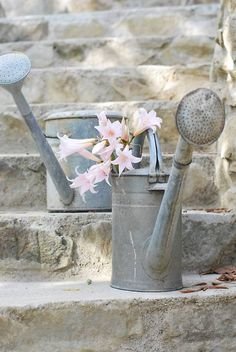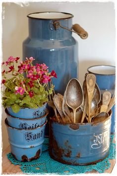 A különböző színű és formájú nagyrészt konyhai edényekből széles a választék, és sok mindenre használhatóak, bátran eresszük szabadjára gondolatainkat és dekoráljunk velük küszöbön innen és túl. Nagy kedvenceim, amikor a régi locsolókanna és tejhordó vázává avanzsálnak. Ütött-kopott tarka lábasokat virágtartóként hasznosíthatunk újra, tésztaszűrőből és lavórból lámpatestet készíthetünk, hogy egy textilkábelre lógatva gondoskodjanak a világításról és romantikus bájt kölcsönözzenek a térnek. További újrahasznosítási lehetőségeket – evőeszköztartó, dekoráció, mosdótál – találhattok még a posztban, de nézzetek körül az interneten is, majd újrahasznosításra fel!