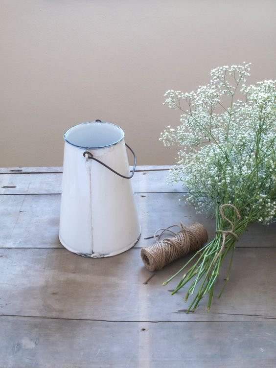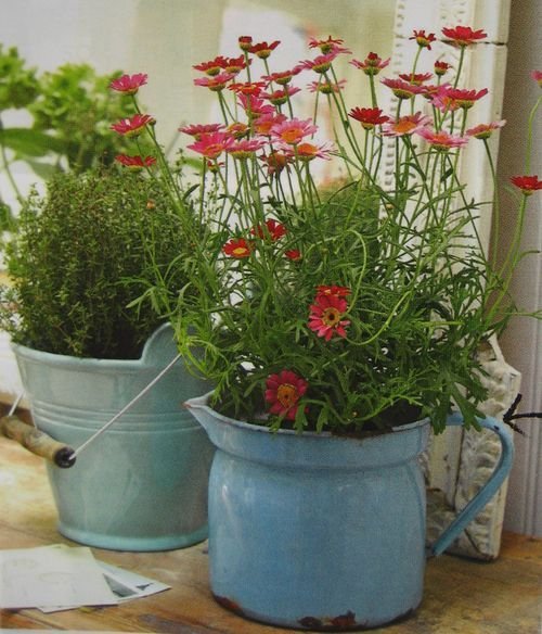 A zománcedények újra reneszánszukat élik: sok gyártónál megjelentek a koptatott, vintage hatású, de újonnan gyártott darabok. Én ebben is az újrahasznosítás híve vagyok, új funkciót adva ezeknek a tárgyaknak különleges, kissé romantikus dekorációra tehetünk szert. Érdemes körülnézni szüleinknél, nagymamánknál, valamint bolhapiacokon is remek edényeket találhatunk. Én legutóbb a család dunaparti nyaralójában bukkantam két gyönyörű piros teafőző és vízforraló edényre, el is hoztam magammal, hogy az erkélyen a virágsarkot díszítse.