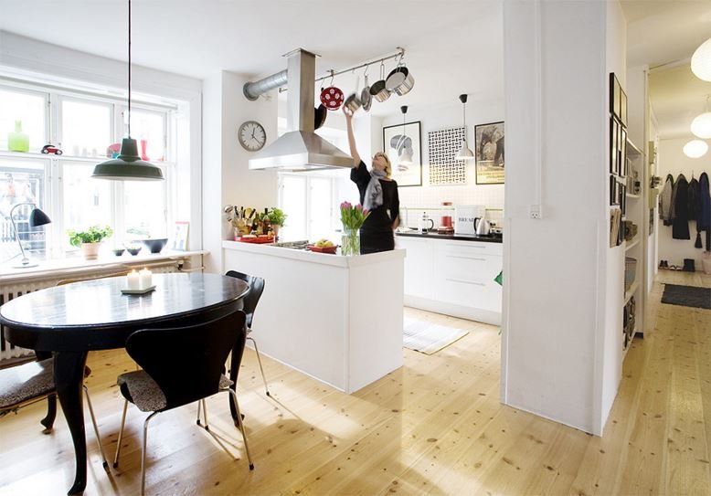Fém, üveg, fa, bőr, textil anyagok teszik izgalmassá a lakást: a szokatlan szögű és alakú falrészek és bútorok különös összhangot alkotnak a sokféle textúrával. A skandináv stílus néha picit túl száraznak hat nekem a sok fehérrel, a loft pedig néha túlságosan maszkulin, de ebben a koppenhágai kégliben pont jó arányban keverednek a stílusok, és egyik sem kerül túlsúlyba.